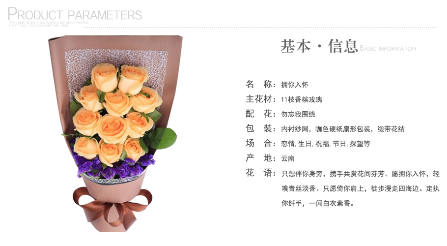 | 产品名称 : | 拥你入怀--11枝香槟玫瑰花束,勿忘我围绕 |