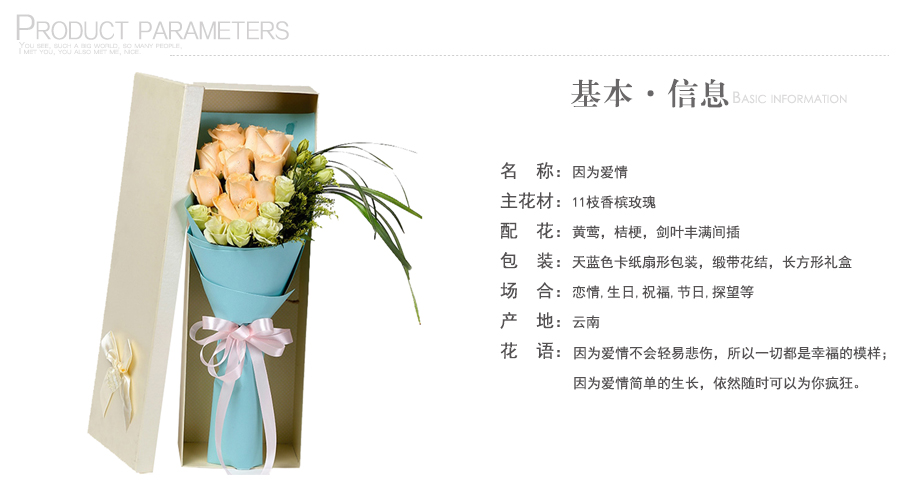| 产品名称 : | 因为爱情--11枝香槟玫瑰礼盒,黄莺 剑叶 桔梗间插 |