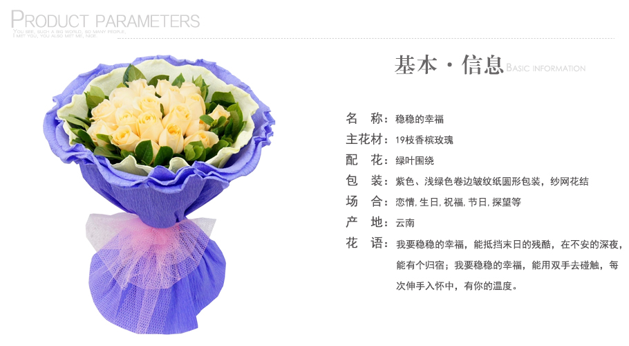 | 产品名称 : | 稳稳的幸福--19枝香槟玫瑰圆形花束 |